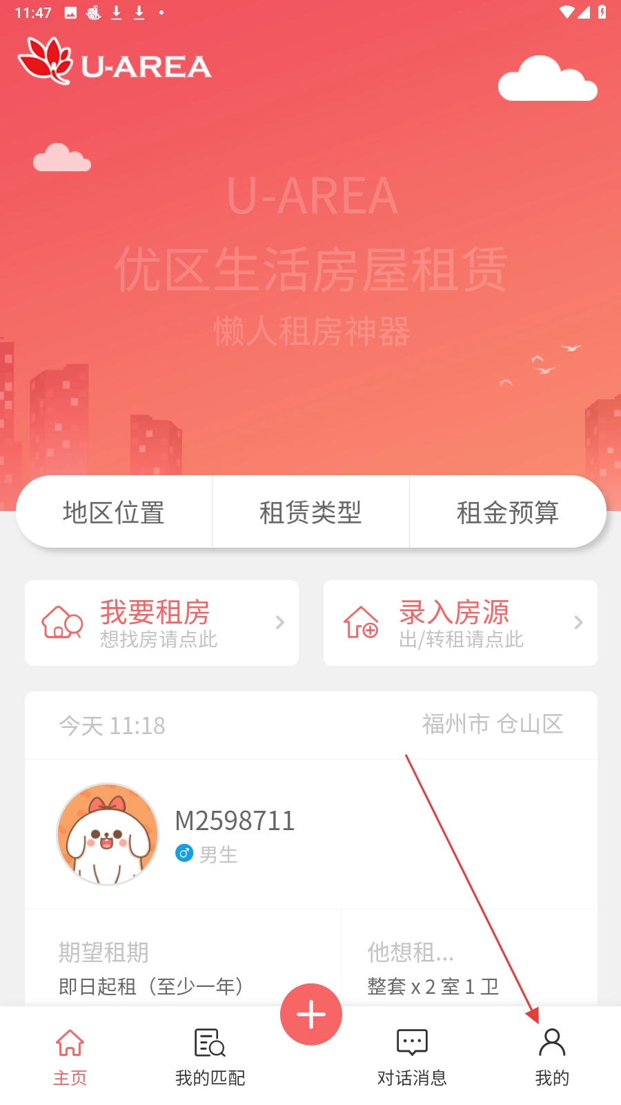 打开优区生活租房应用后,点击底部的【我的】选项,即可进入个人中心页面。