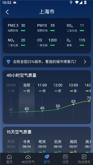 今明天气:呈现今明两日的天气状况详情,能够查看详细的气象信息,包括温度、风级、风速、气压、湿度、降雨概率、紫外线强度以及能见度等,各项数值都十分完备。