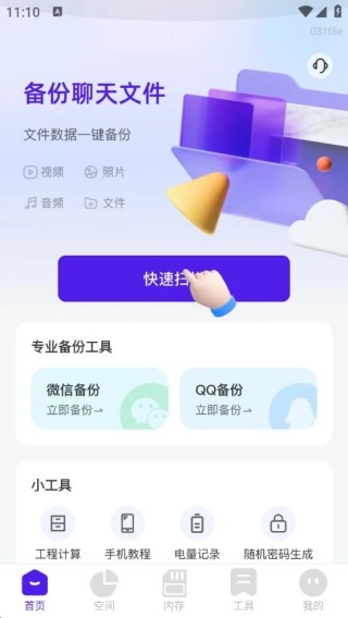 软件成功安装后进入平台首页,就可以快速开启聊天文件的备份操作,点击“快速扫描”即可完成备份;这里的专业备份工具和各类实用小工具也都一应俱全。