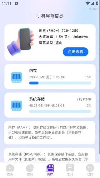 想快速查看手机屏幕显示的内容很简单,只需轻点下方的内存选项,手机的内存容量、存储占用等详细情况就能清晰呈现。