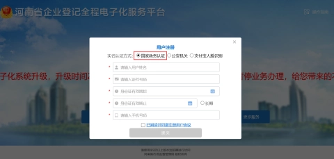 访问河南省企业登记全程电子化服务平台(网址:http://qcdzh.scjg.henan.gov.cn/),在注册环节选择“国家政务认证”方式完成注册。