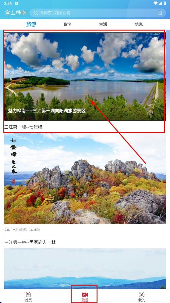 点击页面底部的【发现】按钮,随后切换到旅游、商企等相关板块,即可浏览桦南本地的旅游景点信息,比如向阳湖、七星峰等内容。