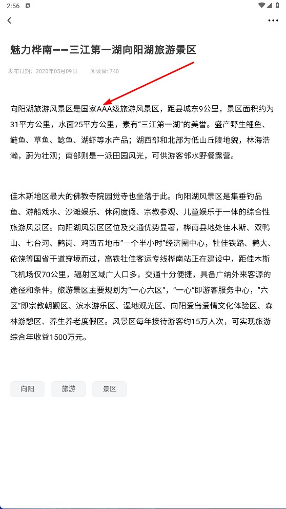 在旅游板块中找到并点击景点资讯(例如“魅力桦南——三江第一湖向阳湖旅游景区”这类内容),进入对应的详情页面后,即可查看该景区的等级、占地面积、特色游玩项目等相关信息。
