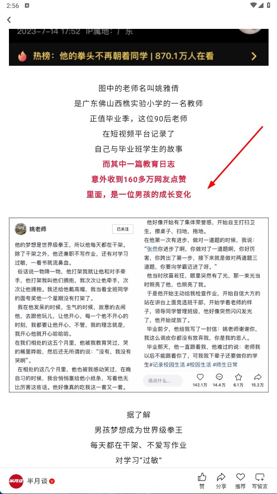 在首页浏览资讯时,若看到感兴趣的内容(比如姚老师的教育故事),可以点击进入详情页进行阅读。
