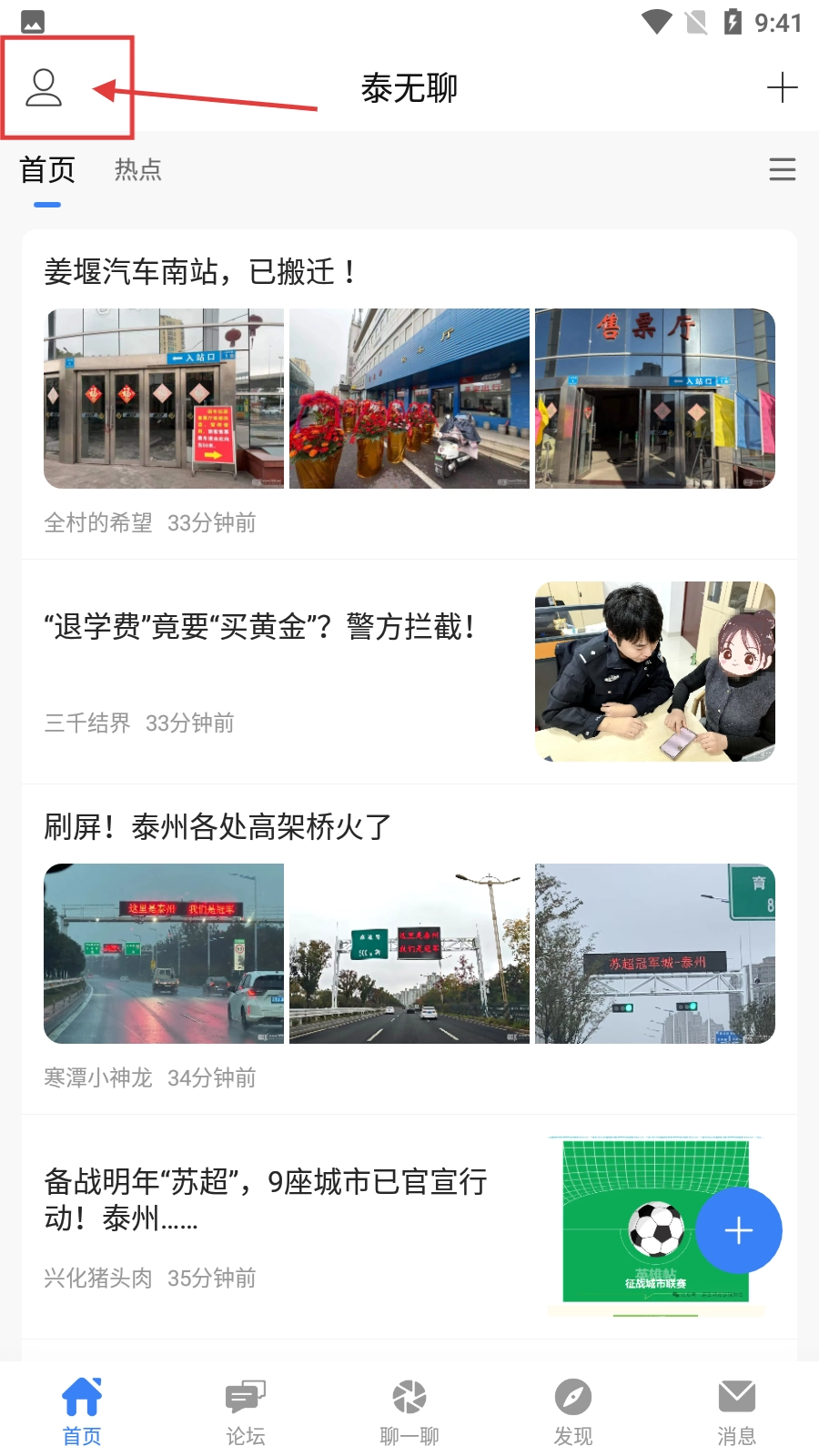 打开【泰无聊】这款软件,接着点击界面左上角的【人形】图标,这样就能进入到与个人相关的页面了。