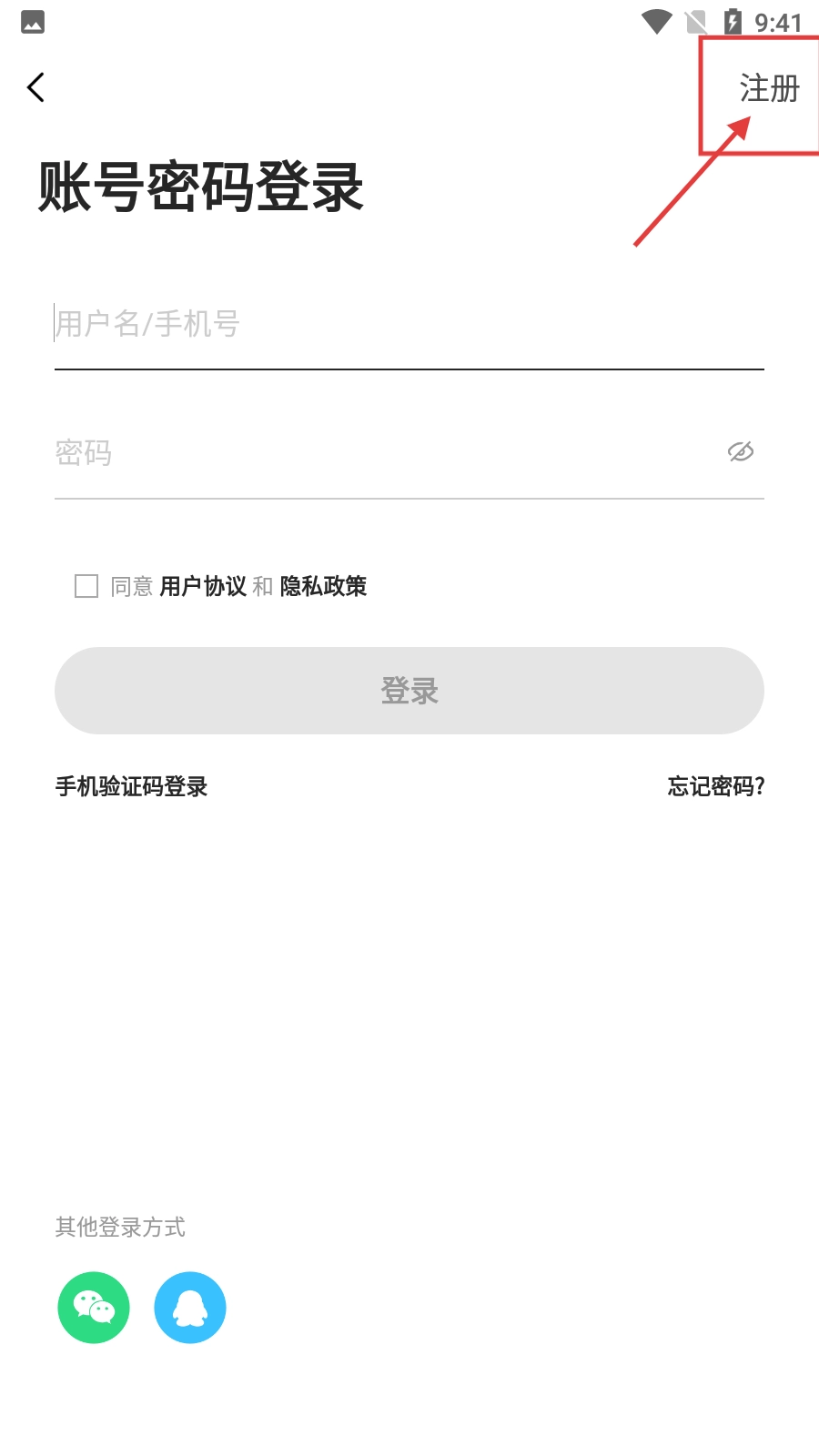 在账号密码登录页面,点击右上角的【注册】按钮,即可启动注册流程。