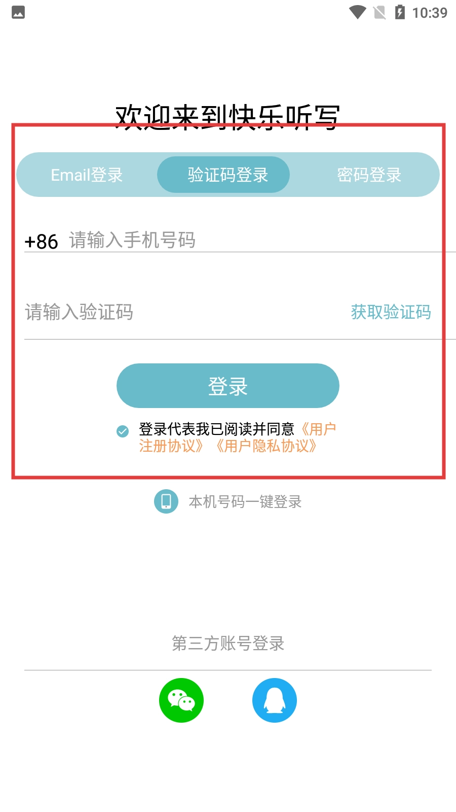 进入【快乐听写】的登录界面后,选择【验证码登录】的方式,接着输入手机号码,随后获取并填写验证码。