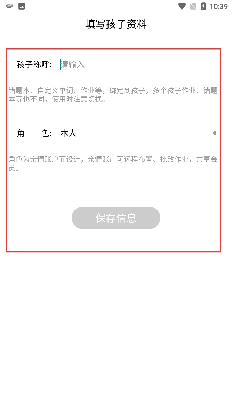 登录后进入【填写孩子资料】界面,输入孩子的称呼,确认角色为本人,然后点击【保存信息】,即可完成资料填写。