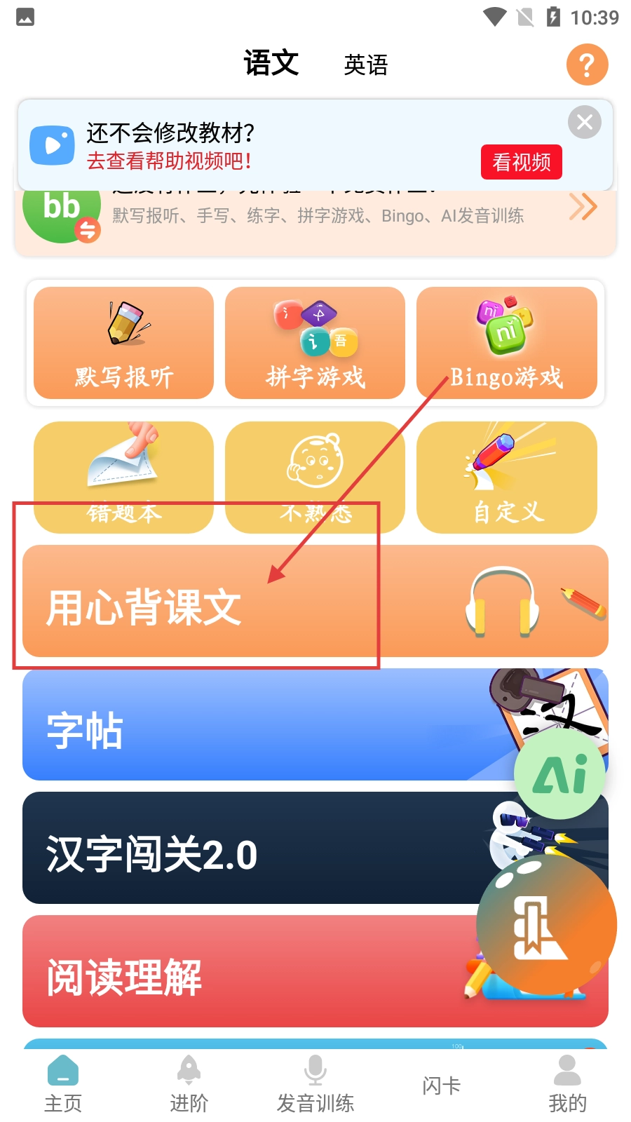 在软件主页的语文板块中,找到并点击【用心背课文】选项,即可进入与课文背诵相关的功能界面。