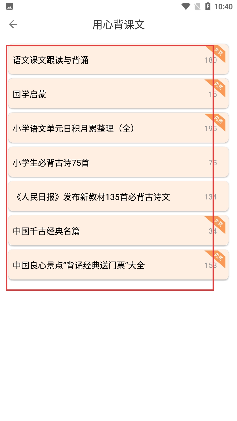 进入【用心背课文】界面后,能选择【语文课文跟读与背诵】【国学启蒙】等多种背诵内容分类,根据自身需求挑选后就可以开启背诵学习。
