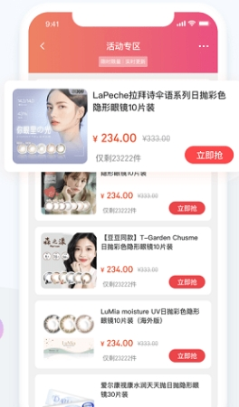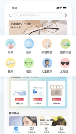 眼镜圈平台所提供的服务产品涵盖隐形眼镜、护理液、眼镜架、光学镜片、太阳镜,以及眼镜行业相关的服务类商品和周边商品等。