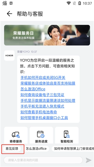若您希望反馈产品使用过程中遇到的问题,或是针对荣耀的产品及服务提出优化建议,可通过“我的”>“设置”>“帮助与客服”>“意见反馈”这一路径提交相关信息。
