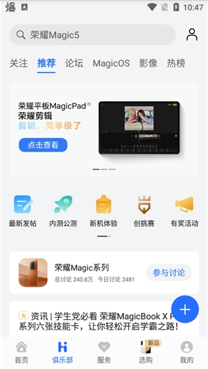 点击【俱乐部】,既能搜索荣耀产品相关的帖子,也能自行发布帖子,点击旁边的【+】按钮就能操作。