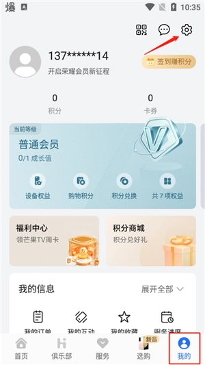 点击“我的”,可以查看设备权益、购物积分、积分兑换等权益内容,同时也能查看订单、互动、收藏等相关信息。