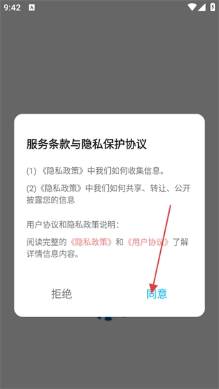 当服务条款与隐私保护协议的弹窗出现时,点击弹窗里的【同意】按钮,即可进入应用的首页。
