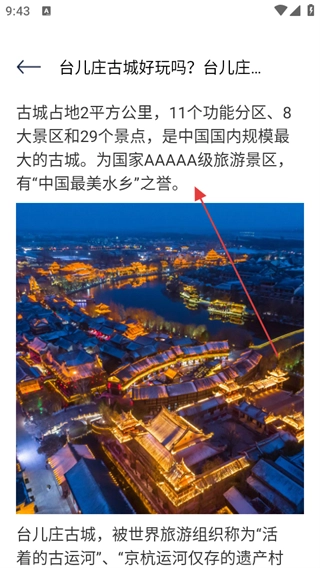 在景点详情页面,你能够了解到该景点的详细信息,像台儿庄古城的规模大小、景区所获等级以及它拥有的美誉等内容都包含在内。