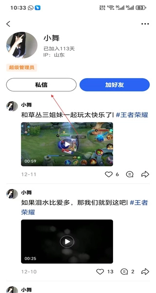 进入小舞的个人主页,浏览她发布的动态内容后,点击私信按钮,开启与该用户的私信交流。