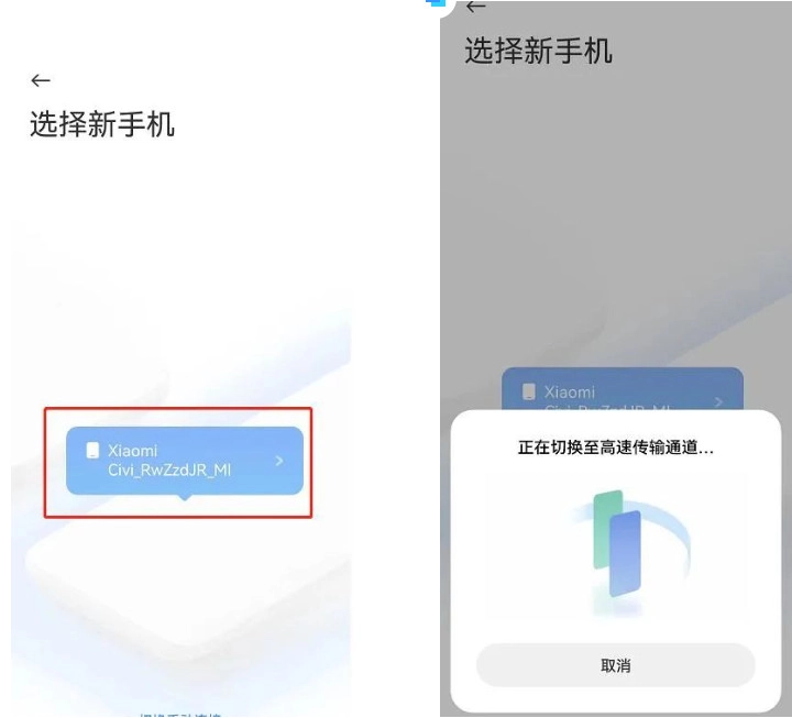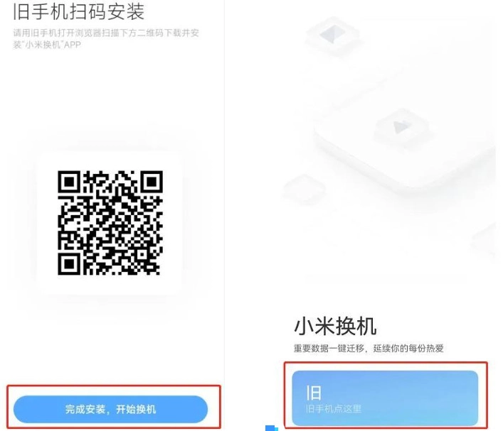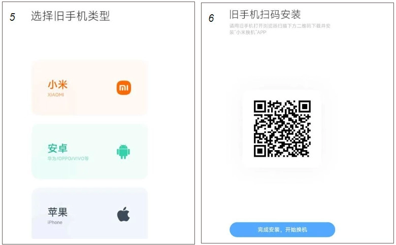 02根据新手机信息,建立连接新手机选择【完成安装,开始换机】,旧手机安装好【小米换机】并开启,点击【旧】后,选择新手机型号,建立连接。