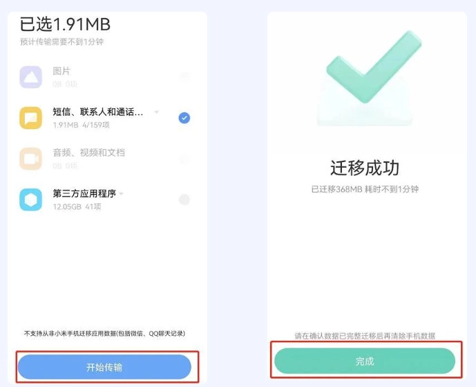 03勾选数据类型,开始迁移连接后,在旧手机中选择要迁移的数据,点击【开始传输】,完成数据迁移后,点击【完成】。