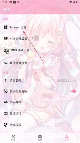 在“其他功能”页面的“设置”分类下,找到并点击“Tyranor设置”。
