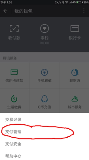 如图所示,点击右上角的三点图标,会弹出一个对话框,接着点击其中的“支付管理”选项。