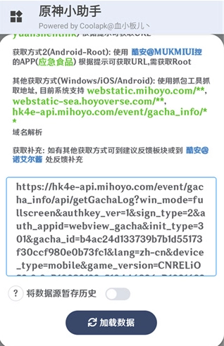 在加载方式页面选择在线地址模式,向下滑动页面后,只需在对应的输入框内粘贴完整的URL即可。获取URL的方法是:可以借助yuanshenlink应用,按照应用内的提示操作就能获取链接,之后将链接输入到框中,点击“加载数据”按钮完成操作。