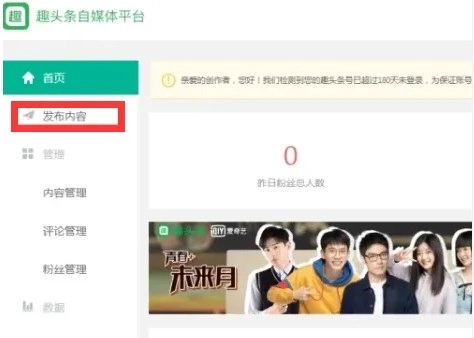 我们先打开软件,完成好趣头条的注册登录操作,进入趣头条主页后,再点击左侧菜单栏里的【发布内容】选项。