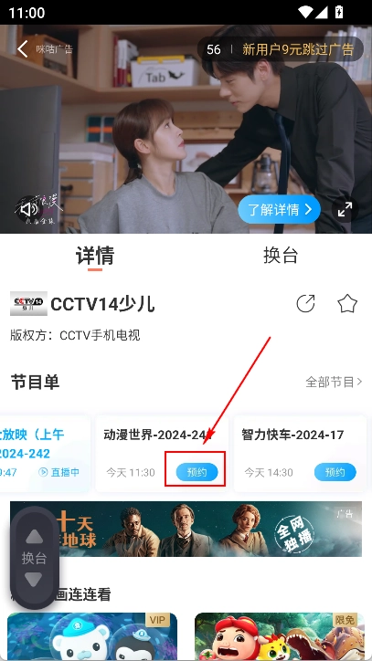 直播节目:在“首页”进入“直播”板块,接着从“全部频道”里选择目标直播,最后点击“预约”即可。