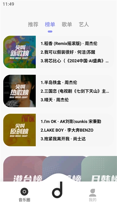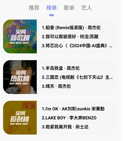 浏览音乐榜单的操作步骤如下:点击界面上的“榜单”选项,即可查看新歌榜、热歌榜以及原创榜单的内容。
