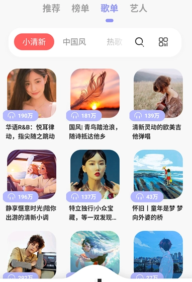 发现并收藏歌单:点击“歌单”选项,即可浏览各类不同分类的歌单,这里提供了小清新等多种风格的歌单资源供你选择。