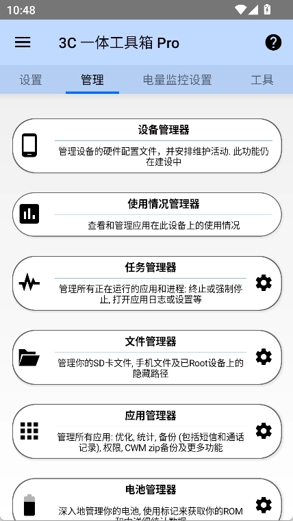电池管理器能够助力识别并优化耗电应用,从而延长电池的使用时长;网络管理器则支持对WiFi接入点的优先级进行设置,还可以配置Android防火墙等功能。