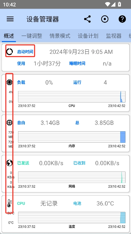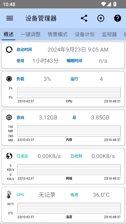 点击“设备管理器”后,在该界面中能够实时查看手机的使用时长、负载情况、CPU状态等多项数据的监测信息。