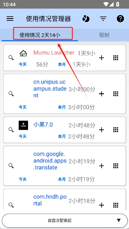 在首页点击“使用情况管理器”,就能查看手机的使用情况,并且可以对某一款手机软件设置使用限制。