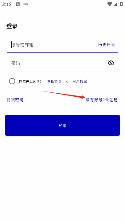 注册与登录:打开应用后,点击“没有账号?去注册”按钮即可进行注册操作。