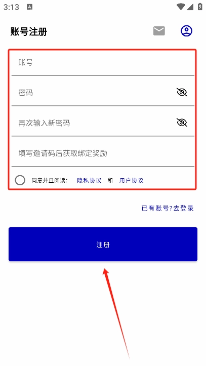 在注册页面填写账号、密码等必填信息后,点击“注册”按钮。