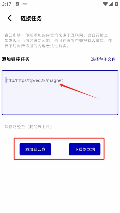 在页面右上角点击“+”号,选择“链接任务”选项,复制粘贴链接后,点击“到本地”或“添加到云盘”即可完成操作。