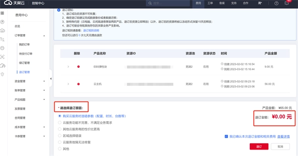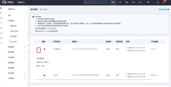 在进行退订操作前,请务必仔细阅读退订须知,随后确认需要退订的资源相关信息,具体涵盖产品名称、资源ID、规格、时间以及可退订的金额。