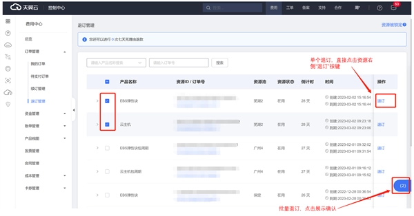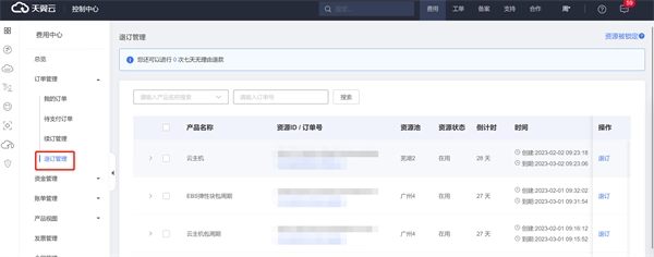 您可以通过访问天翼云官网(www.ctyun.cn)完成登录操作,随后依次进入【费用中心】板块,在该板块下找到并点击【订单管理】选项,最后进入【退订管理】页面即可。