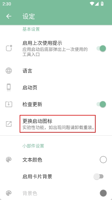 在设定界面中,找到并点击“更换启动图标”。