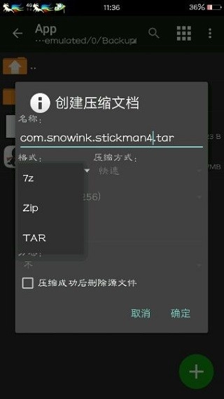 打开ZAchiver,先给原来的tar格式压缩包重命名,复制好它的名称后就能删除这个压缩包了。接着长按修改后的data文件,选择“压缩…”选项,压缩格式依旧保持为tar。