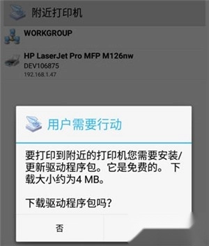 在附近打印机中找到设备后,点击该设备会弹出安装驱动包的提示,此步骤必须完成,否则将无法进行打印操作。