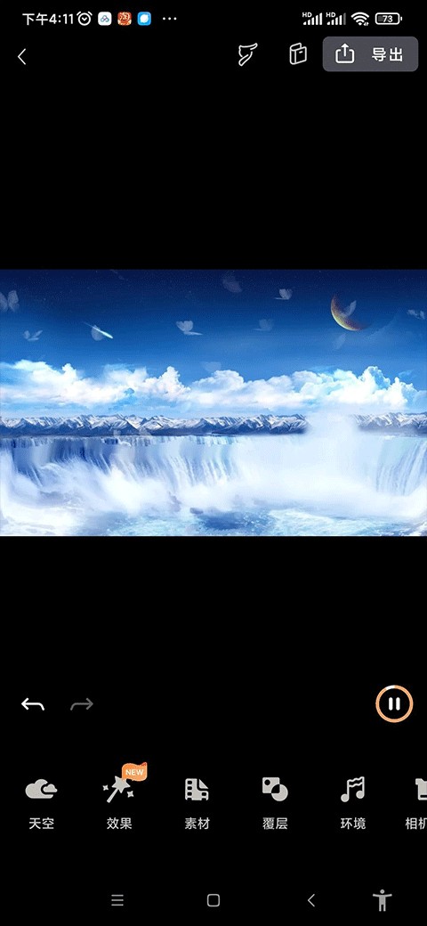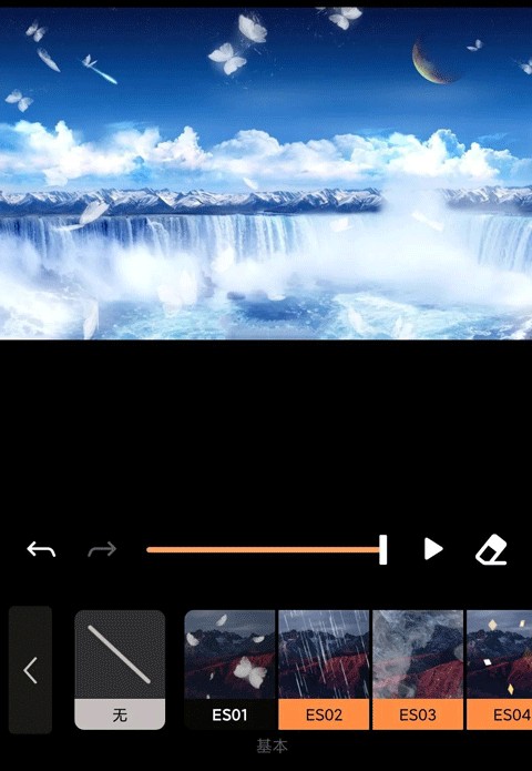 接下来点击“覆层”选项,从中选择图示的“ES09”效果——这个效果会添加飞舞的蝴蝶元素,不过也可以根据喜好选择其他特效;完成选择后,点击右上角的“导出”按钮即可。