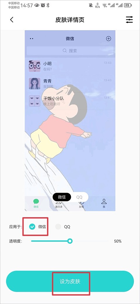 进入皮肤详情页面后,勾选微信选项,调整好透明度,然后点击设为皮肤按钮。