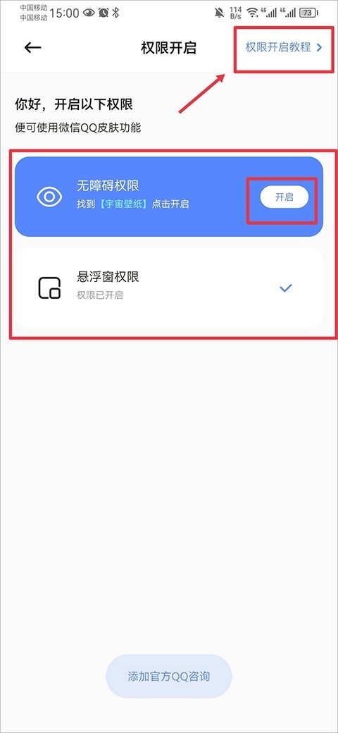 最后把微信皮肤功能的权限打开,打开之后就能更换成功啦,要是不知道怎么开启权限,还能点击权限开启教程查看具体步骤哦。