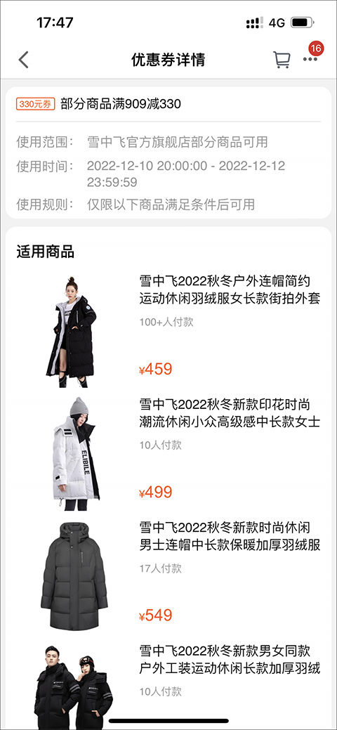 在红包卡券界面中,我们能看到券、红包、卡、票以及其他类型的权益,平台甚至还会为用户保留已使用、已过期或已删除的券记录。以“雪中飞旗舰店”的券为例,点击即可使用。