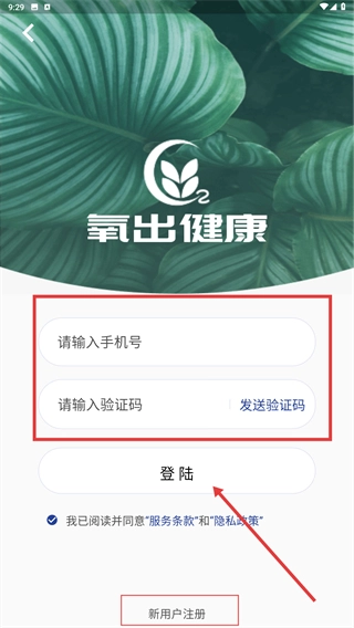 在【氧出健康】的登录页面,先输入手机号码,接着获取并填写验证码,再勾选相关协议,最后点击【登录】按钮就能完成登录操作。