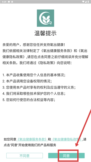阅读《氧出健康服务条款》和《氧出健康隐私政策》后,点击“同意”按钮,确认接受协议即可进入应用。