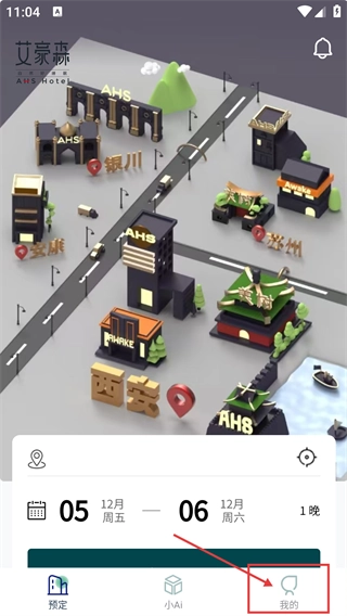 进入【艾豪森-AHS-Hotel】的预订界面后,你可以选择目标城市,接着点击页面底部的【我的】选项,就能进入个人中心页面了。