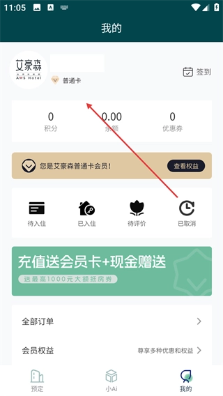 进入【我的】页面后,你可以查看【普通卡】会员的相关信息,包括积分和余额情况;同时也能看到【待入住】【已入住】等不同状态的订单,此外会员权益也可以在这里进行查看。