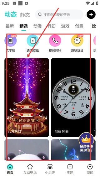在壁纸应用的精选页面里,你可以找到【创意钟表】类的动态壁纸。这类壁纸呈现出带有天气信息和步数显示的表盘设计,只需点击一下,就能进入对应的详情页面啦。
